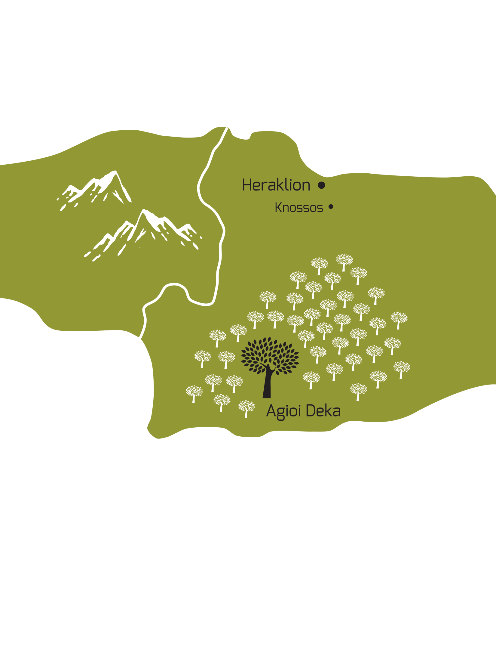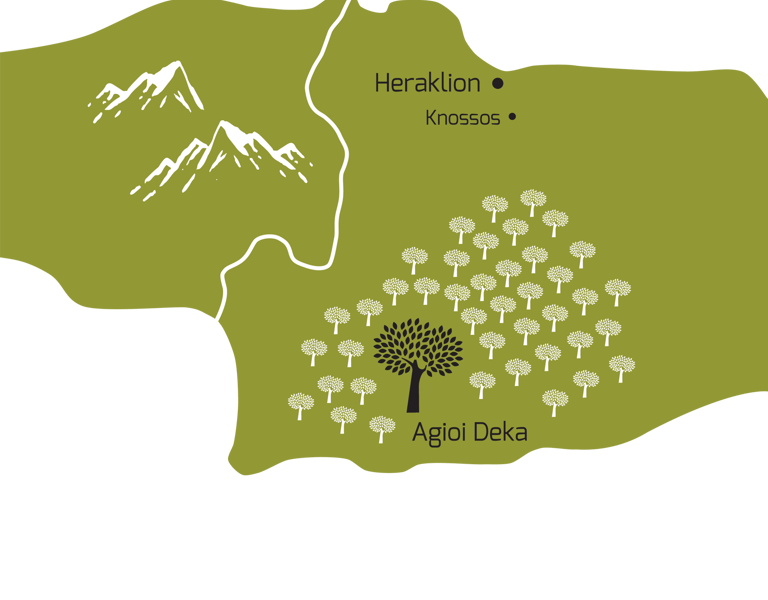 Nos olives sont récoltées dans notre village d’Agioi Deka (les 10 Saints), situé dans le sud de la Crète. Plus grande île de Grèce, la Crète est le berceau de la civilisation minoenne où l’olivier était vénéré comme un symbole de paix, prospérité et santé.